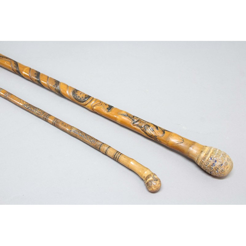 Meiji, carved with a twisting snake chasing a beast, three character signature and red seal, length 89cm; together with another, similar, carved with various figural scenes, length 85cm (2)