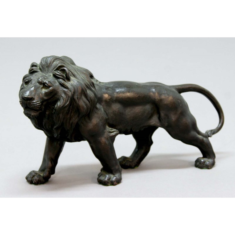 JAPANESE BRONZE LION, first half 20th century, standing looking to the left, three character signature seal to underside, length 38cm
