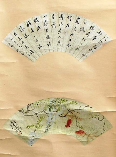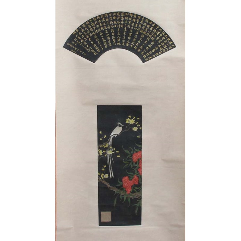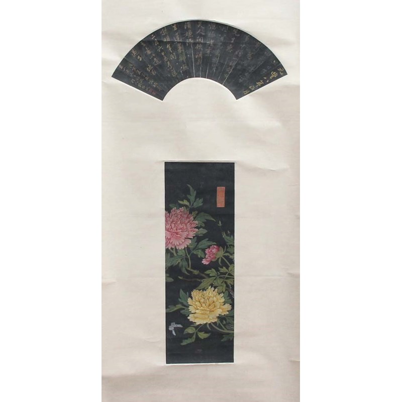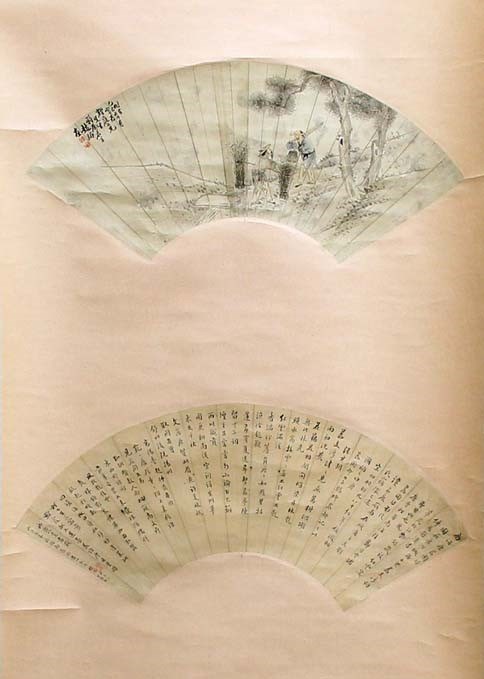each depicting a fan and another scene, either figural or landscape, some with extensive inscriptions, and another with a gilt mon with inscription (5)