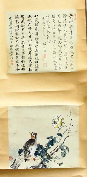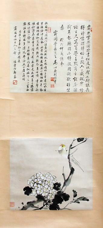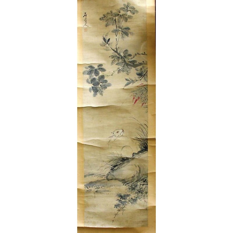 THREE CHINESE SCROLL PAINTINGS, to include two with birds in foliage beneath a poem and another of a white hare in grass (3)