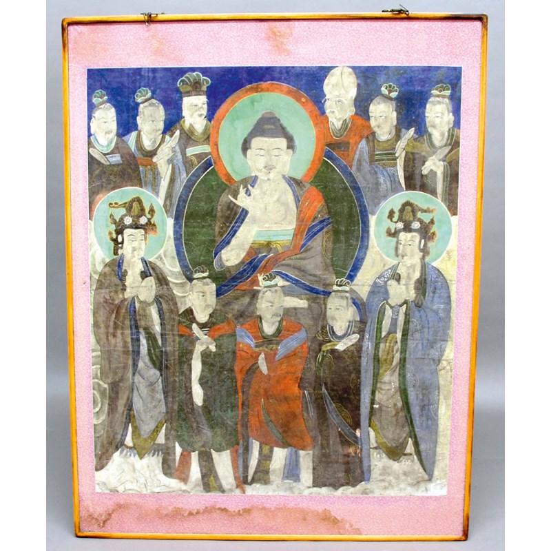 possibly Korean, a central Immortal surrounded by eleven further figures, in a silk mount and wooden frame, size of picture 108cm x 91cm