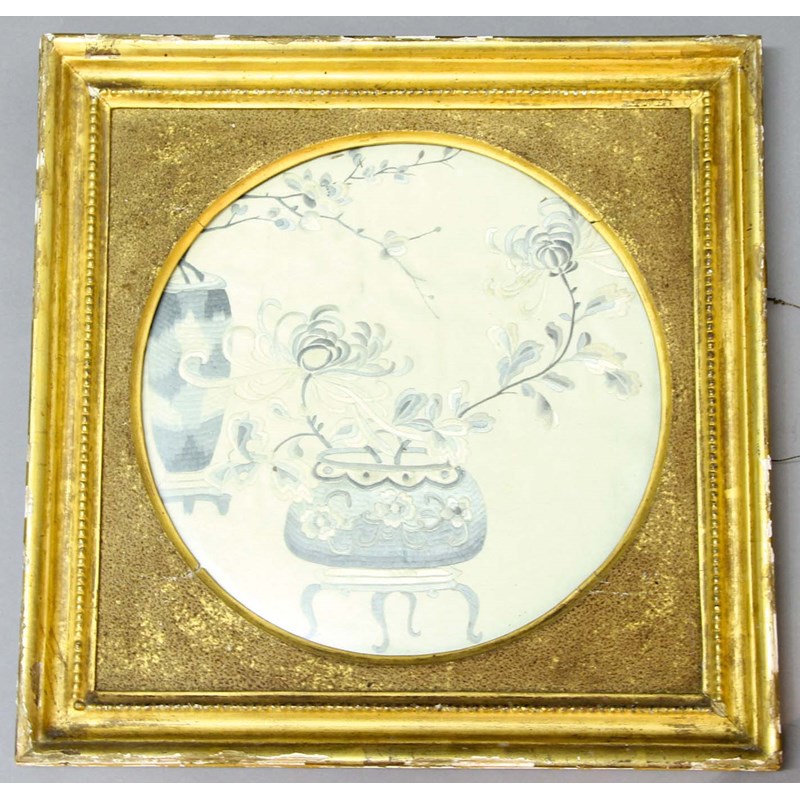 CHINESE SILK CIRCULAR PANEL, 19th century, worked in tones of blue and grey with a vase of flowers, a further vase with prunus beyond, diameter 29cm
