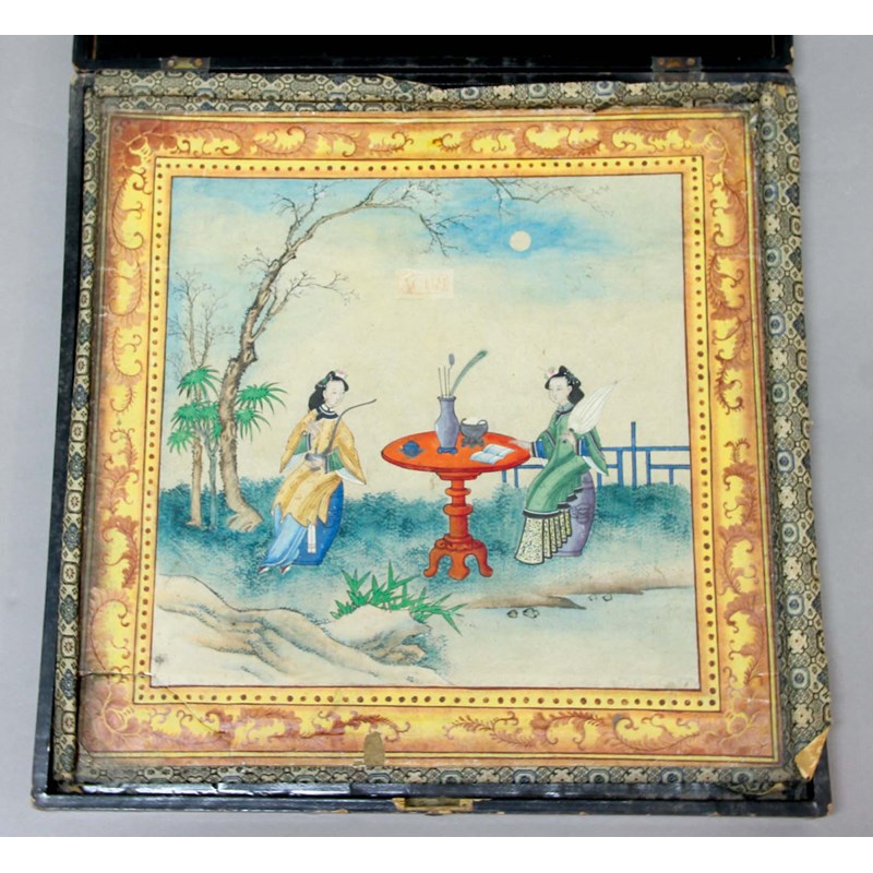 Two ladies in a garden by a table, inside a scrolling border, watercolour, 49cm x 49cm; housed in a Chinese export black lacquered and gilt box and cover, decorated withfigures in a garden, 55cm x 55cm (2)