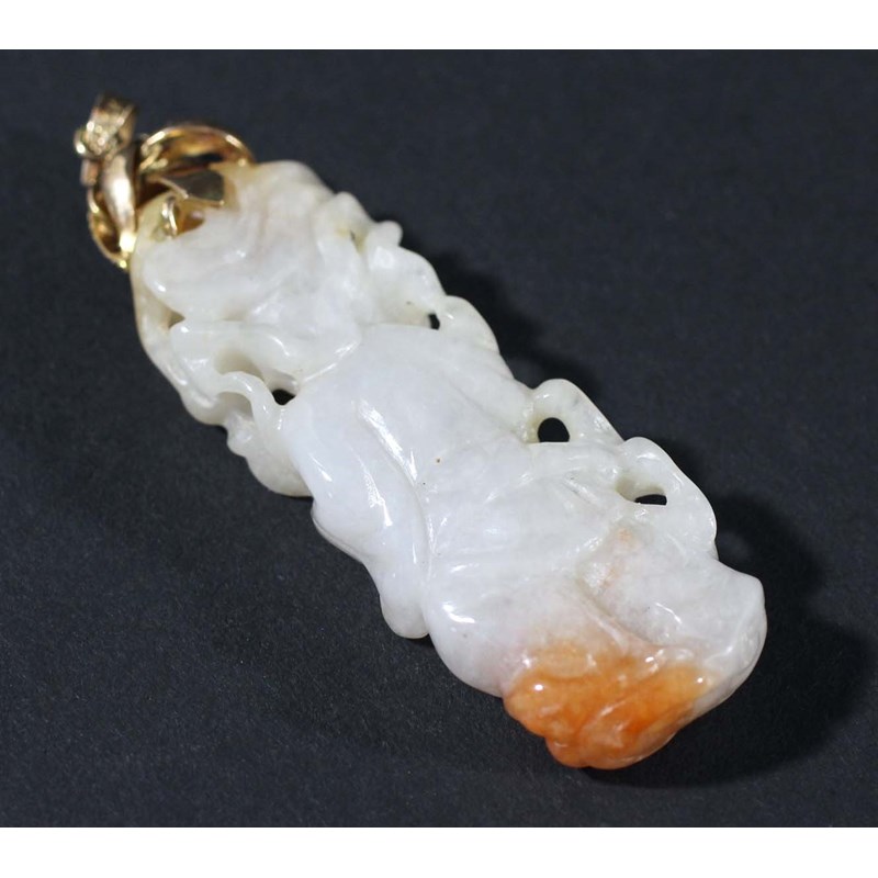 CHINESE WHITE AND RUSSET JADE PENDANT, carved as a man holding a fruiting peach branch, with gold mounts stamped 14k, height 6.5cm