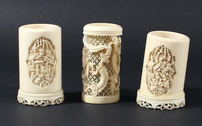 19th century, carved with Canton style cartouches of figures amongst trees and pagodas, on scrolling bases, height 10cm and smaller; together with a reticulated vase, carved with scrolling dragons, height excluding hardwood stand 10cm (3)