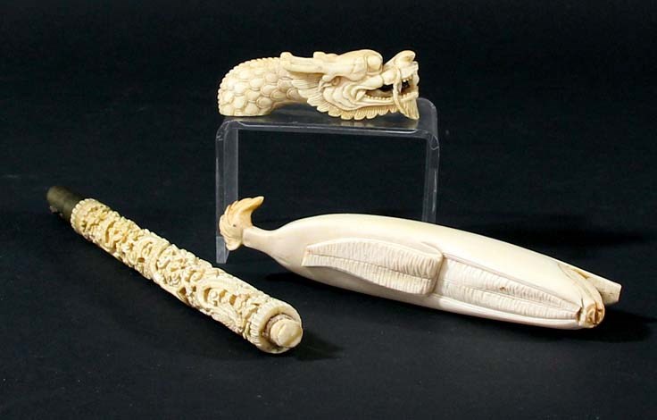 19th century, carved in the canton style with dragons amongst foliage, length 18cm; together with another carved as a dragons head, length 7cm; and a Japanese ivory carving of a banana, length 14cm (3)