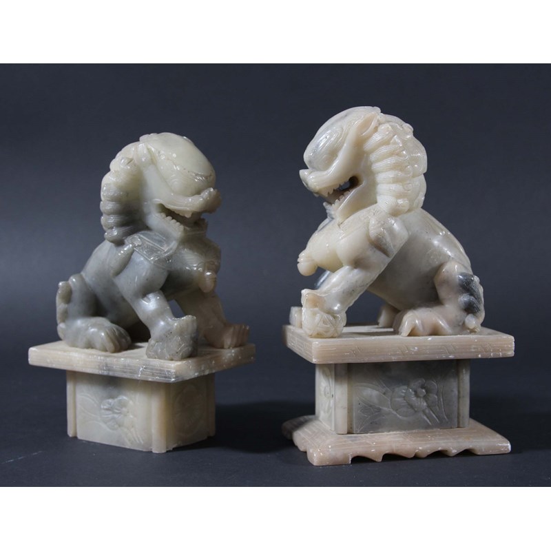PAIR OF CHINESE ALABASTER GUARDIAN LIONS, carved seated with a front foot on a ball and cub, height 19cm (2)