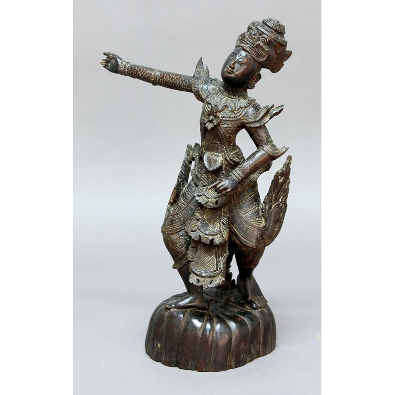 TIBETAN CARVED WOODEN DANCER, late 19th or 20th century, standing with her right arm outstretched, with elaborately carved head piece and outfit, height 65cm