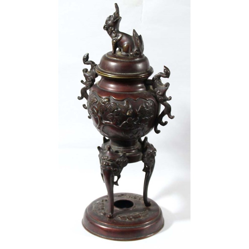 CHINESE BRONZE KORO AND COVER, the two handled urn with tree decoration, the domed cover with guardian lion finial, on a tall, tripod base and domed foot, height 29cm