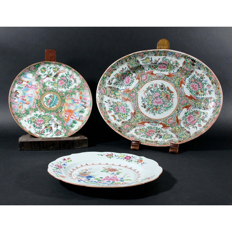 CHINESE CANTON STYLE OVAL PLATTER, 19th century, enamelled with floral and bird scenes, 37cm; together with two similarly decorated plates and two famille rose plates (5)