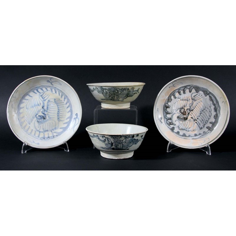 TEK SING CARGO: a pair of bowls blue painted with a stylised landscape, 6678 and 9950, diameter 14cm; and a pair of plates painted with a phoenix, 100, diameter 17.5cm, all with Nagel Auctions stickers (4)