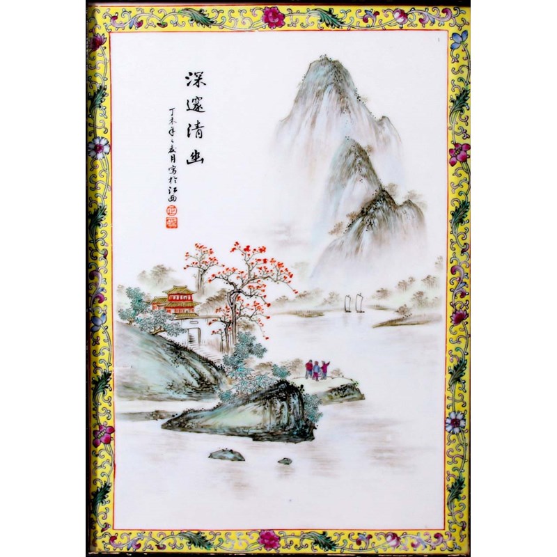 20th century, enamelled with figures on a promontory before a pavillion by a lake with wooded mountains in the back ground, black signature and inscription and red seals, inside a border with meandering flowering foliage on a yellow ground, 31cm x 21.5cm