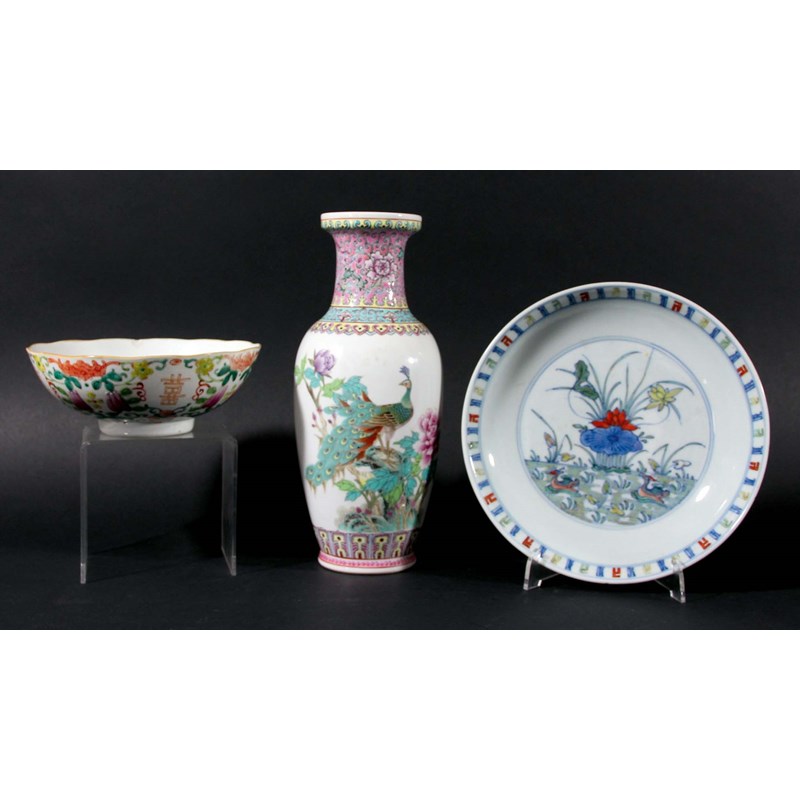 probably 19th century, decorated with ducks before a large lotus flower, blue painted seal mark inside double blue rings, diameter 20.5cm; together with a bowl, probably Qianlong, enamelled with buddhistic symbols, fruiting vines and bats, iron red mark, diameter 16.5cm; and a famille rose vase, 20th century, enamelled with a peacock, an inscription verso, printed marks, height 26cm (3)