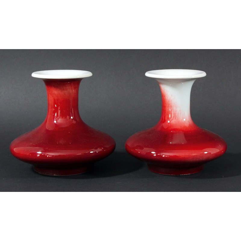 of squat baluster form, the red flambe glaze shading to white on the neck and rim, blue seal marks, height 13.5cm (2)