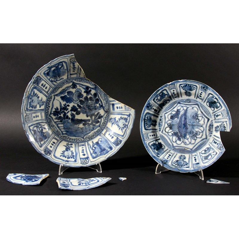 probably Wanli, blue painted with flowers inside a lappet border, diameter 26.5cm; and another, similar but smaller and painted with trophies, diameter 21cm (2)