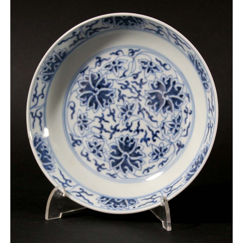 CHINESE BLUE AND WHITE SAUCER DISH, painted with an Indian Lotus patterm, blue painted Guangxu six character mark and probably period, diameter 15.5cm