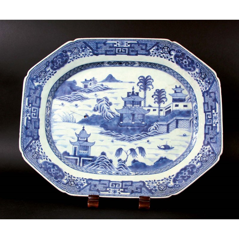 PAIR OF CHINESE BLUE AND WHTE CHARGERS, late 18th century, painted with a fisherman by pavillion on an island, length 46cm (2)