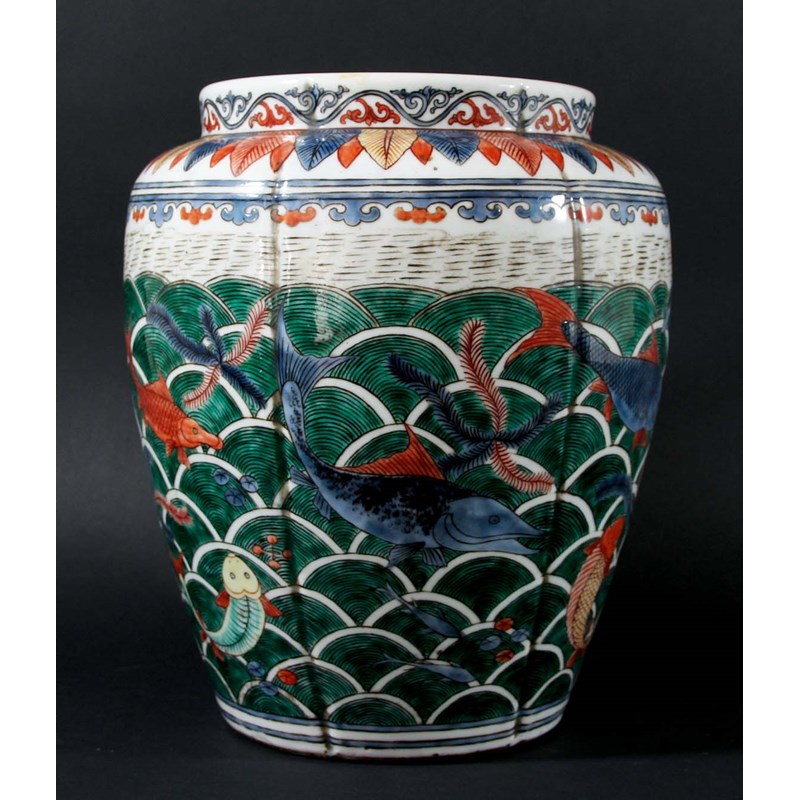 CHINESE FAMILLE VERTE MING STYLE VASE, of tapering, shouldered form, enamelled with numerous fish in a wavy sea beneath stiff leaves to the shoulders and a meandering rim, Jiajing style six character mark, height 29cm