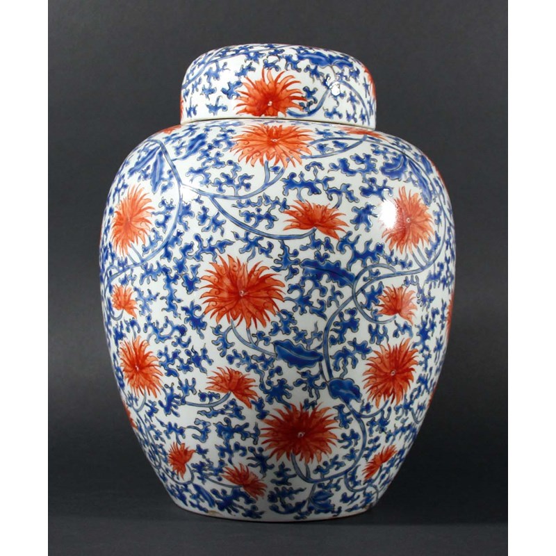 CHINESE GINGER JAR AND COVER, late 19th or 20th century, with iron red enamelled flowers and blue scrolling foliage, previously a lamp base, height 31cm