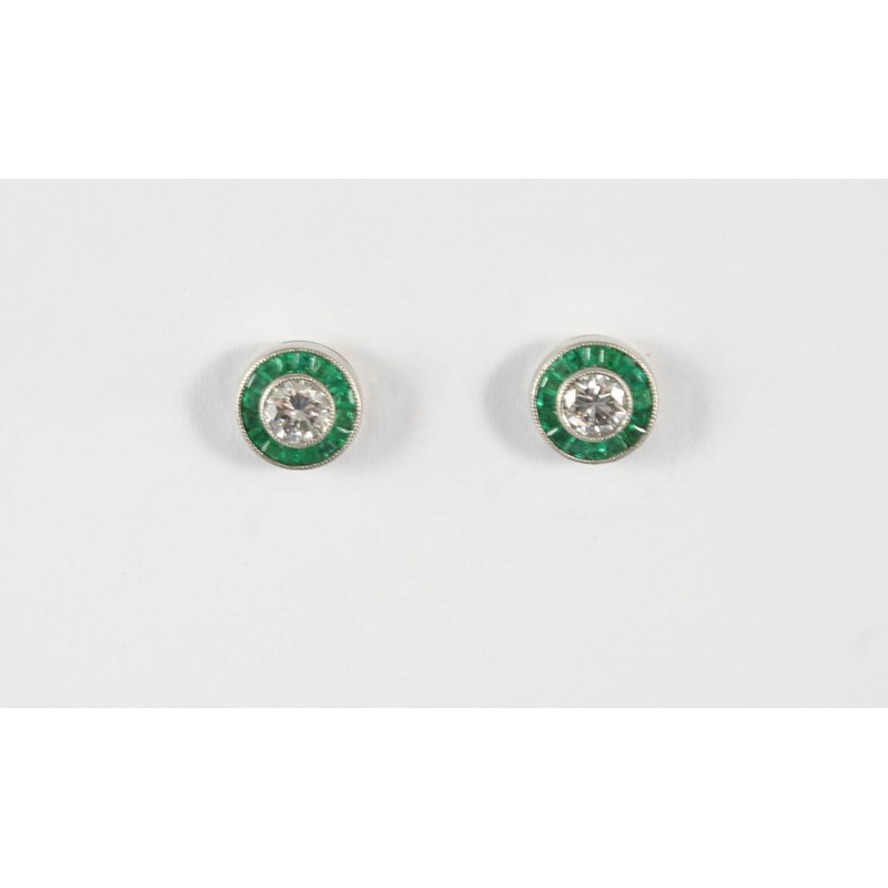 A PAIR OF EMERALD AND DIAMOND CLUSTER STUD EARRINGS each set with a circular-cut diamond within a surround of calibre-cut emeralds.