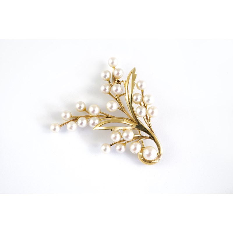 A CULTURED PEARL FOLIATE SPRAY BROOCH mounted with graduated cultured pearls in gold, 6cm. wide.