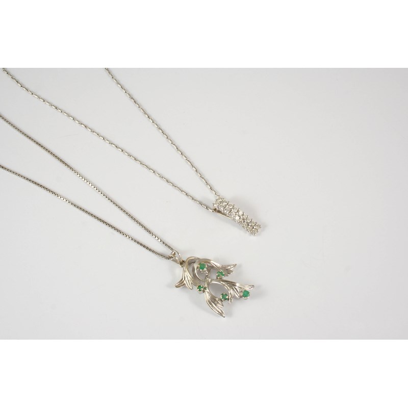 A DIAMOND PENDANT formed as two rows of circular-cut diamonds, on an 18ct. white gold chain, together with an emerald and white gold pendant, on an 18ct. white gold chain.