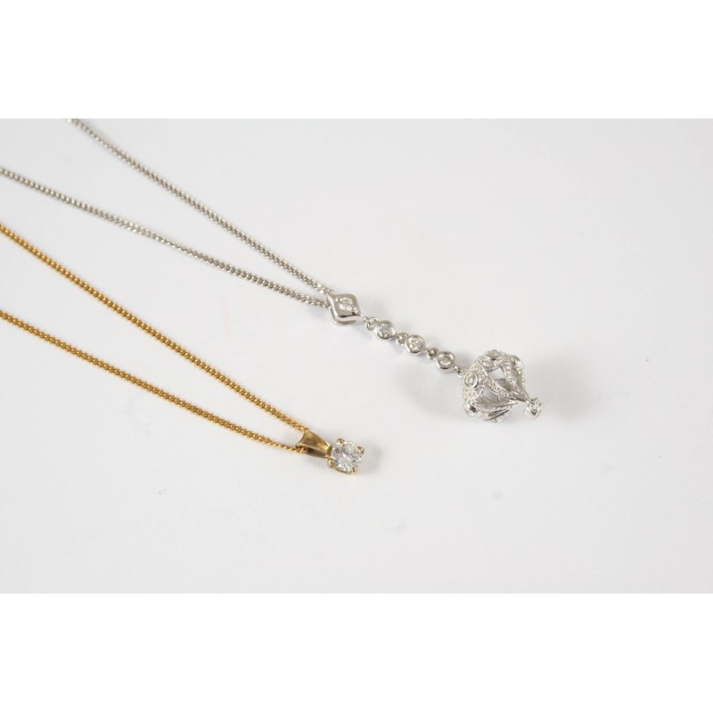 A DIAMOND SOLITAIRE PENDANT the circular brilliant-cut diamond is set in 9ct. yellow gold, on a 9ct. yellow gold fine link chain, together with a diamond and 18ct. white gold pendant, 3cm. long.