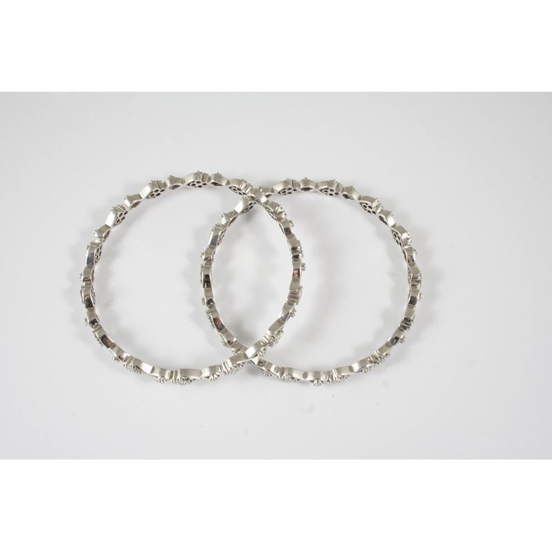 A PAIR OF DIAMOND SET BANGLES each openwork bangle is mounted with quatrefoils of circular-cut diamonds, each divided by a single circular diamond, in white gold, inner diameter 6.0cm., total weight 37.5 grams.