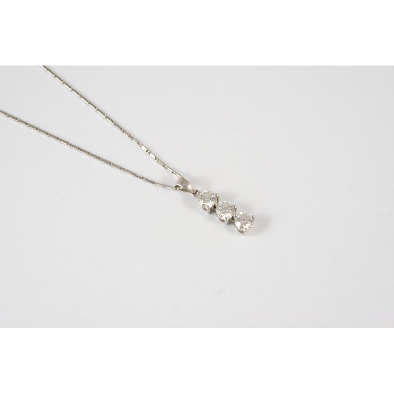 the three brilliant-cut diamonds weigh approximately 0.75 carats in total and are set in 18ct. white gold, on a fine link 18ct. white gold neckchain.