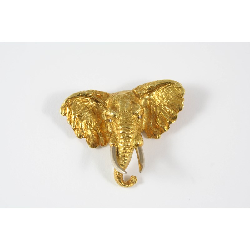 AN 18CT. GOLD ELEPHANT'S HEAD BROOCH realistically formed, with diamond set eyes, 4.5cm. wide. 24.8 grams.