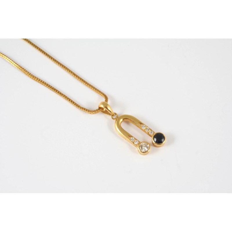 A GOLD, SAPPHIRE AND DIAMOND PENDANT the gold pendant is mounted with a circular-cut diamond and sapphire and five smaller diamonds, on an 18ct. gold chain.