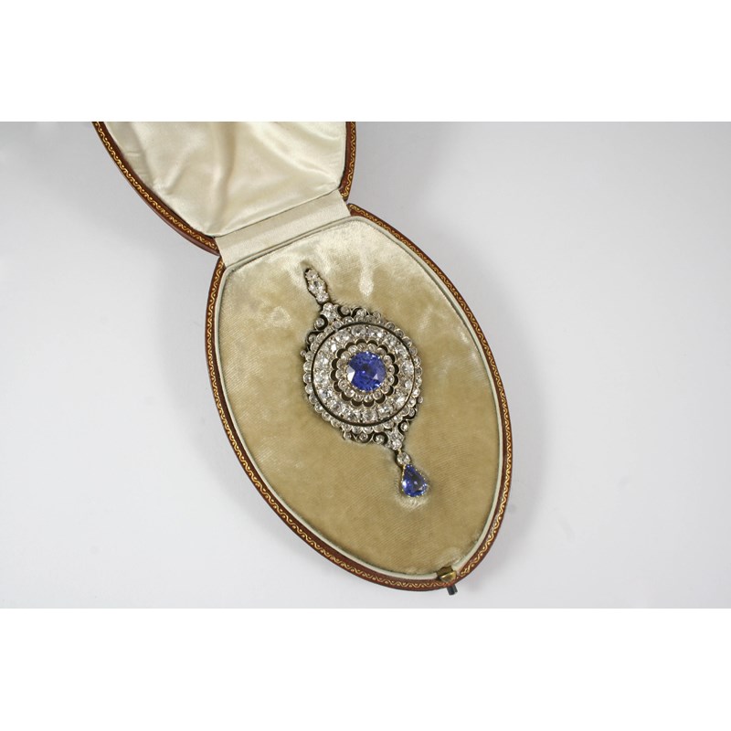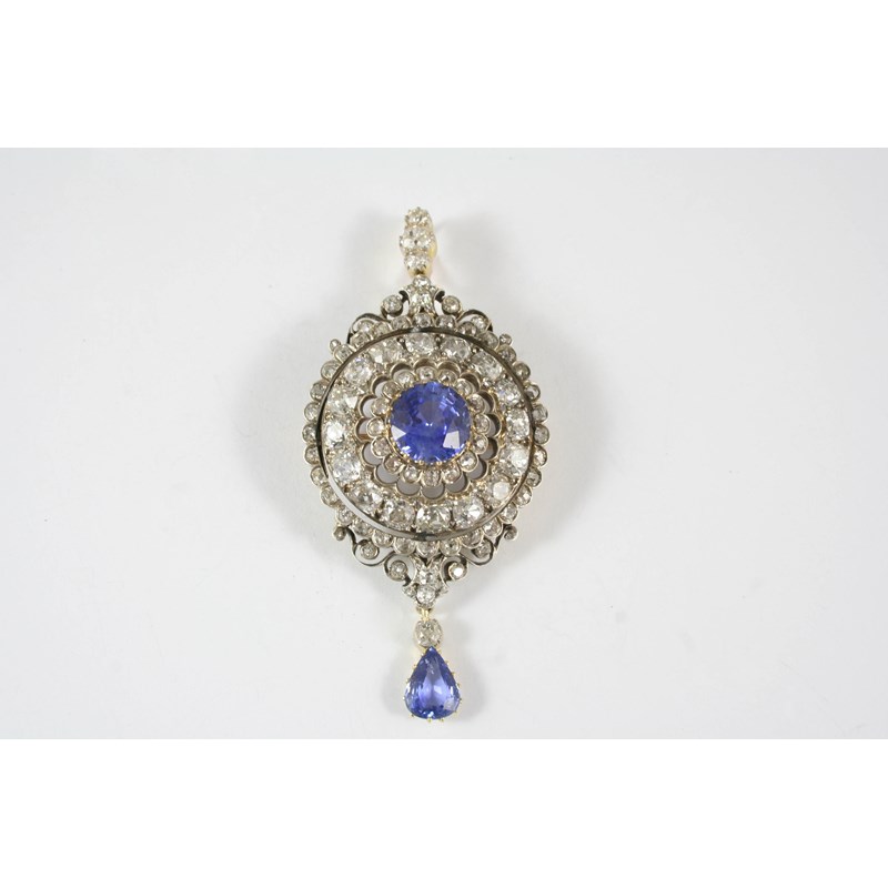 the central circular-cut sapphire is set within a surround of graduated cushion-shaped diamonds, suspending a pear-shaped sapphire drop, in silver and gold, 7.5cm. long.