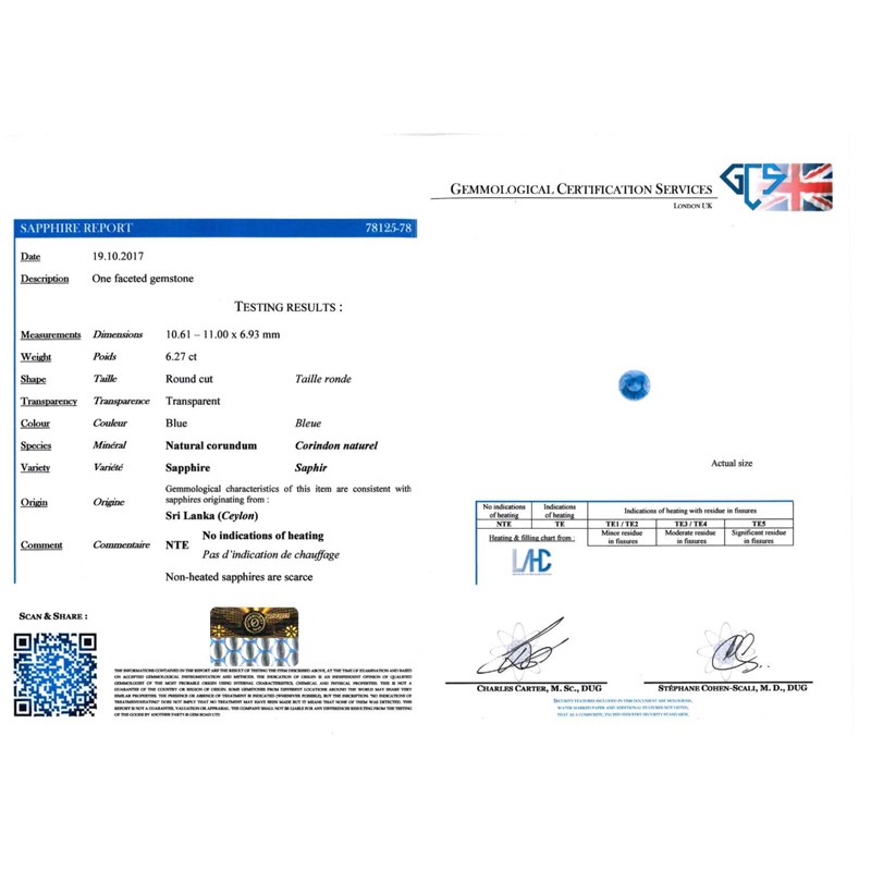 Accompanied by report number 78125-78 from GCS dated 19th October 2017 stating that the central round cut sapphire weighs 6.27 carats and that it is a natural sapphire with no indications of heating.