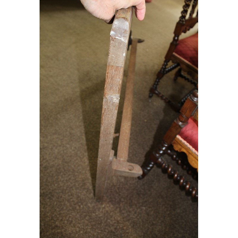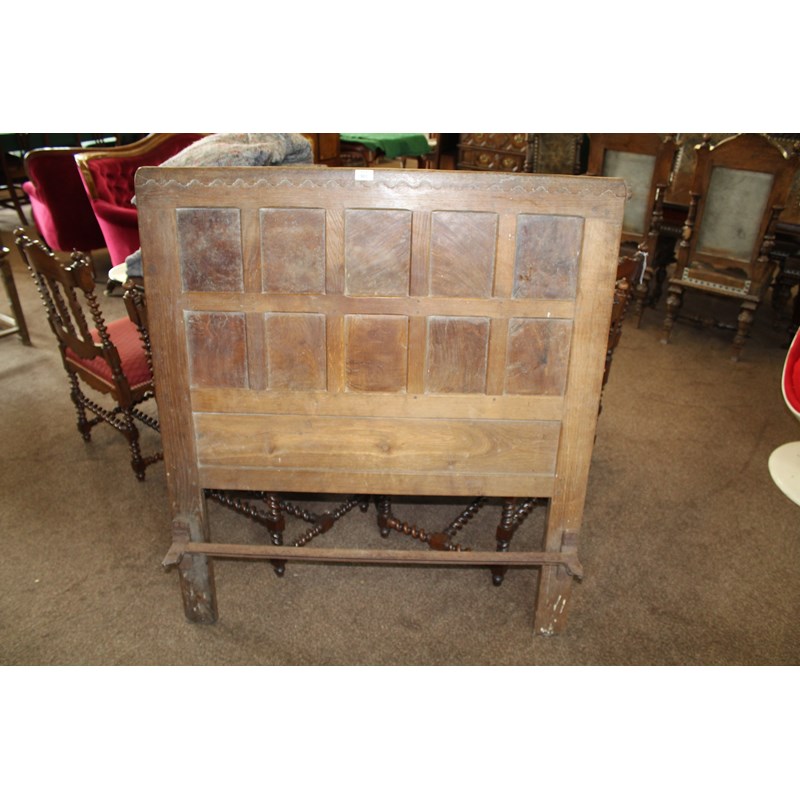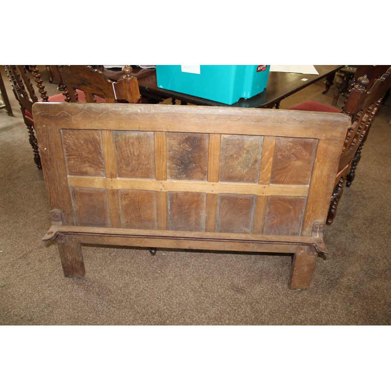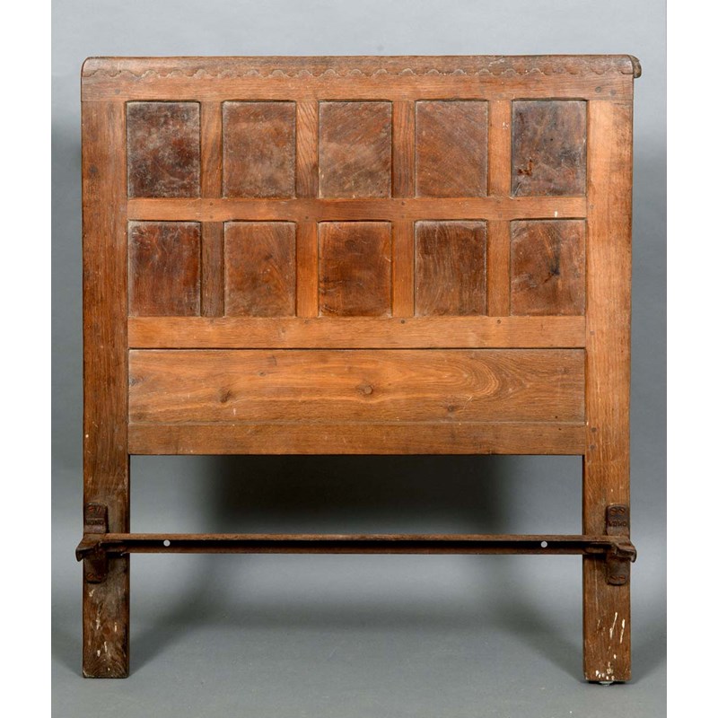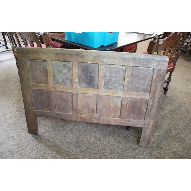 a 3ft 6' single bed, made in oak with panelled backs and arcaded top rails. Both ends with carved Mouse signature. With it's metal irons. Headboard 123cms high, 107cms across, Bottom end 77cms high, 107cms across