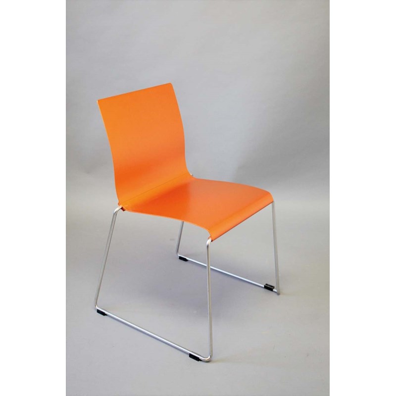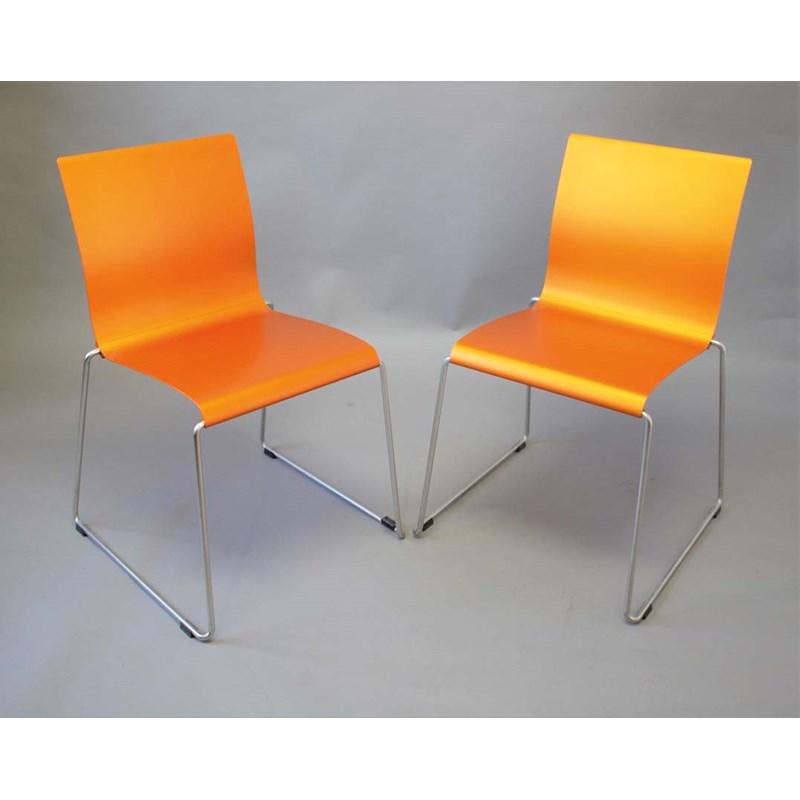 a set of 12 stackable stainless steel chairs with orange finish to the seats and backs, designed by Fredrik Mattson and Stefan Borselius for BLA Station (Sweden). 32ins (81cms) high. (12)