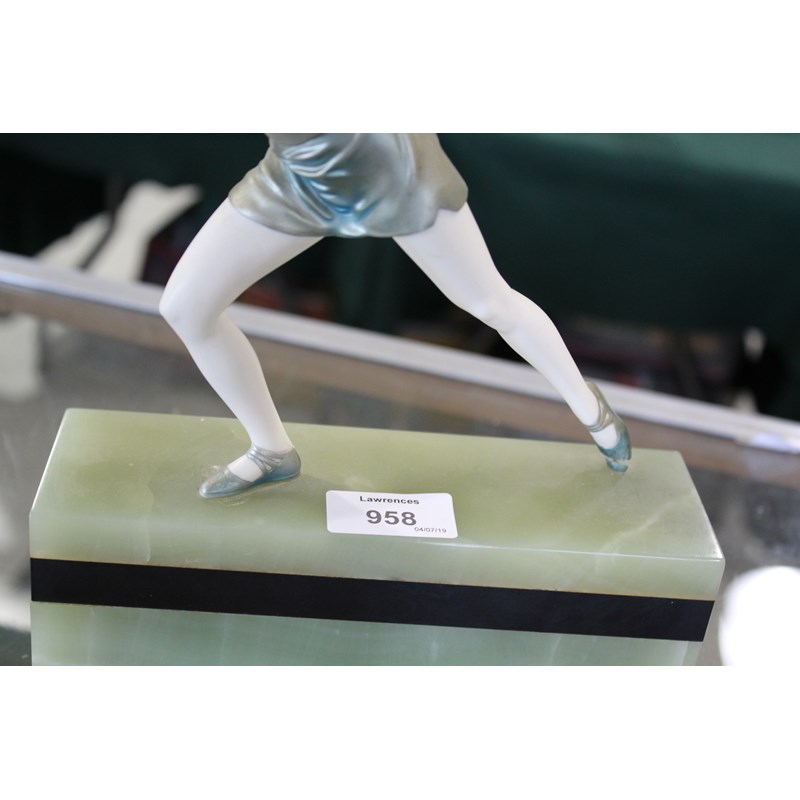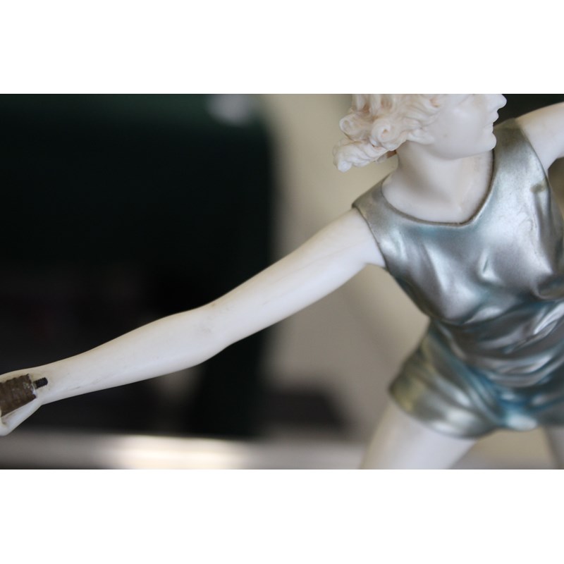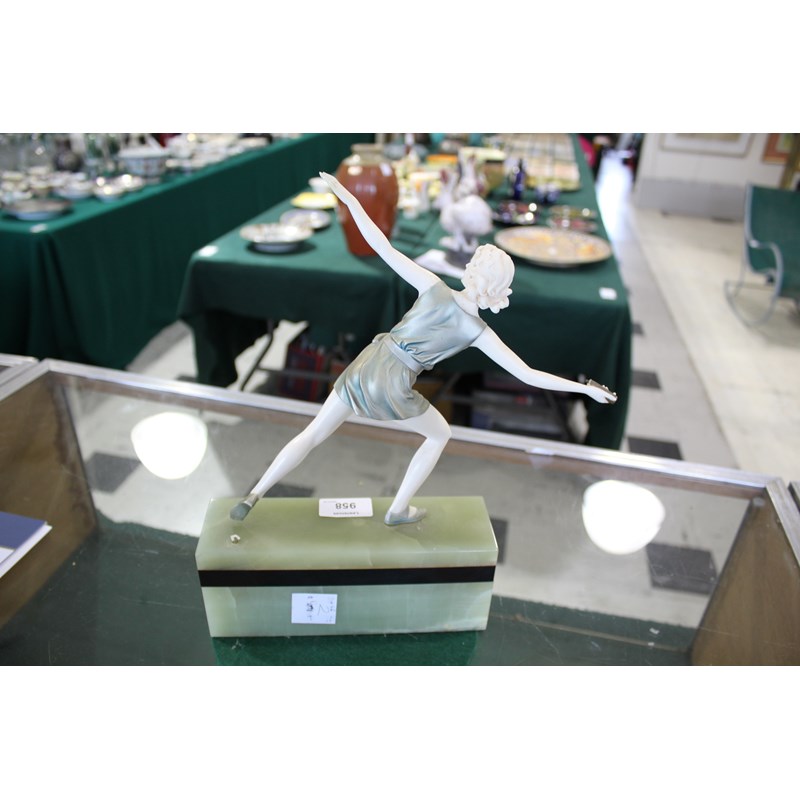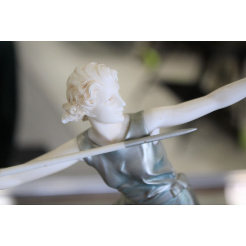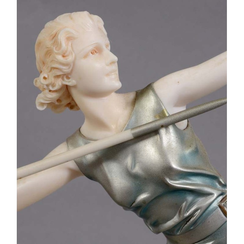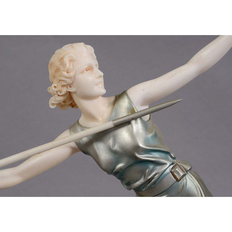 a circa 1925 cold painted bronze and ivory figure of a female javelin thrower, mounted on an onyx base. A little damage to one shoe. Signed on one side of the base, F Preiss. 12 1/4ins (31cms) high