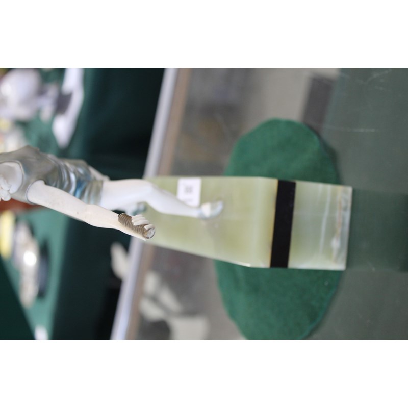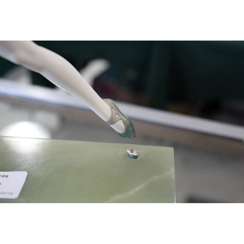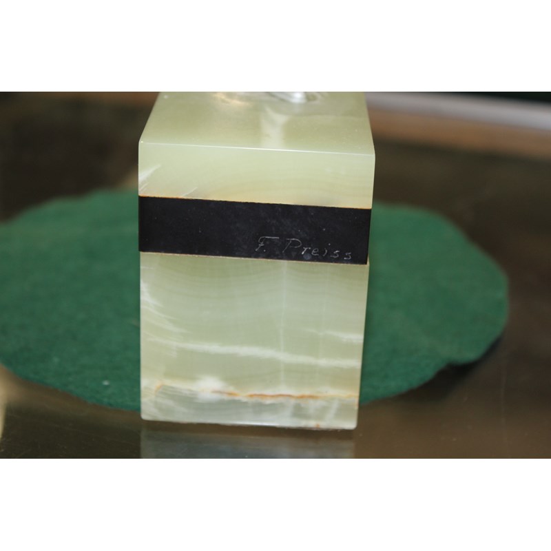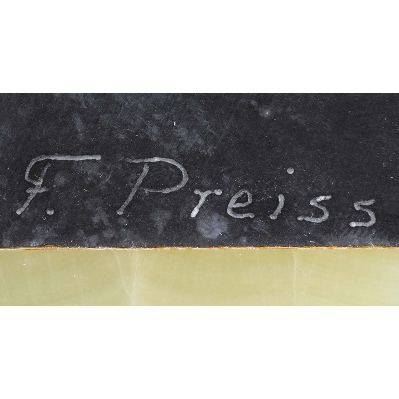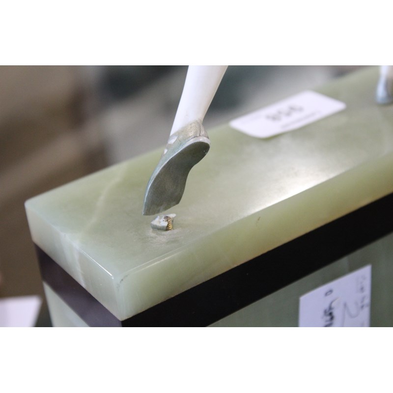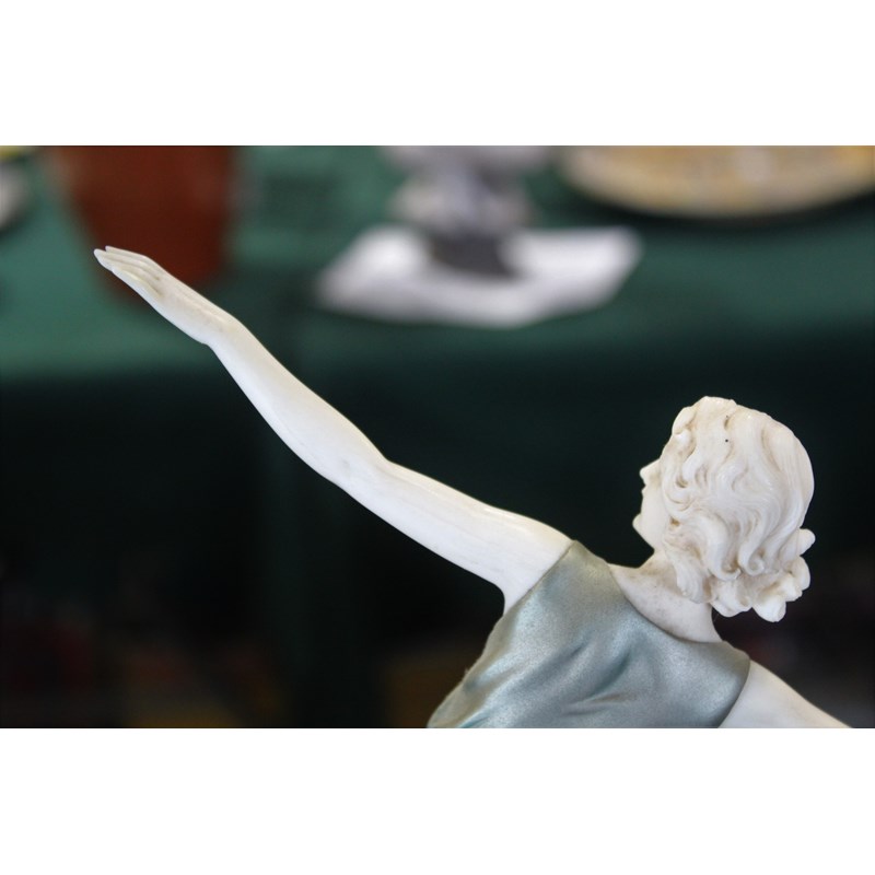 a circa 1925 cold painted bronze and ivory figure of a female javelin thrower, mounted on an onyx base. A little damage to one shoe. Signed on one side of the base, F Preiss. 12 1/4ins (31cms) high