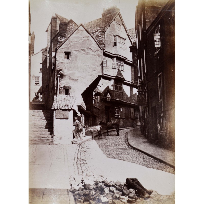 Old Bristol. A late nineteenth century album of 76 engraved views, photographs, etc. of Bristol architecture and scenery, a few hand-coloured, including a watercolour of Baldwin Street by George Delamotte, contemporary full calf gilt, rubbed, bookplate of John E. Pritchard, 4to