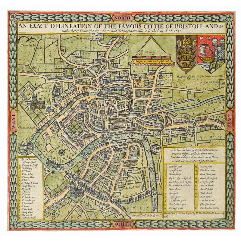The maps include: Braun and Hogenberg's Brightstowe, double-page, uncoloured, 520mm x 371mm, [c.1581]; James Millard's An Exact Delineation of the Famous Cittie of Bristoll, double-page, hand-coloured, 243mm x 227mm, [c.1671]; Benjamin Donne's A Plan of the City of Bristol, double-page, third edition, 540mm x 382mm, [c.1782]; John Rocque's Bristol, folding and backed on linen, 477mm x 530mm, [1780]; J. Mathews' City and Suburbs of Bristol, double-page, 488mm x 382mm, [1794] (and 4 other editions, some backed with linen).