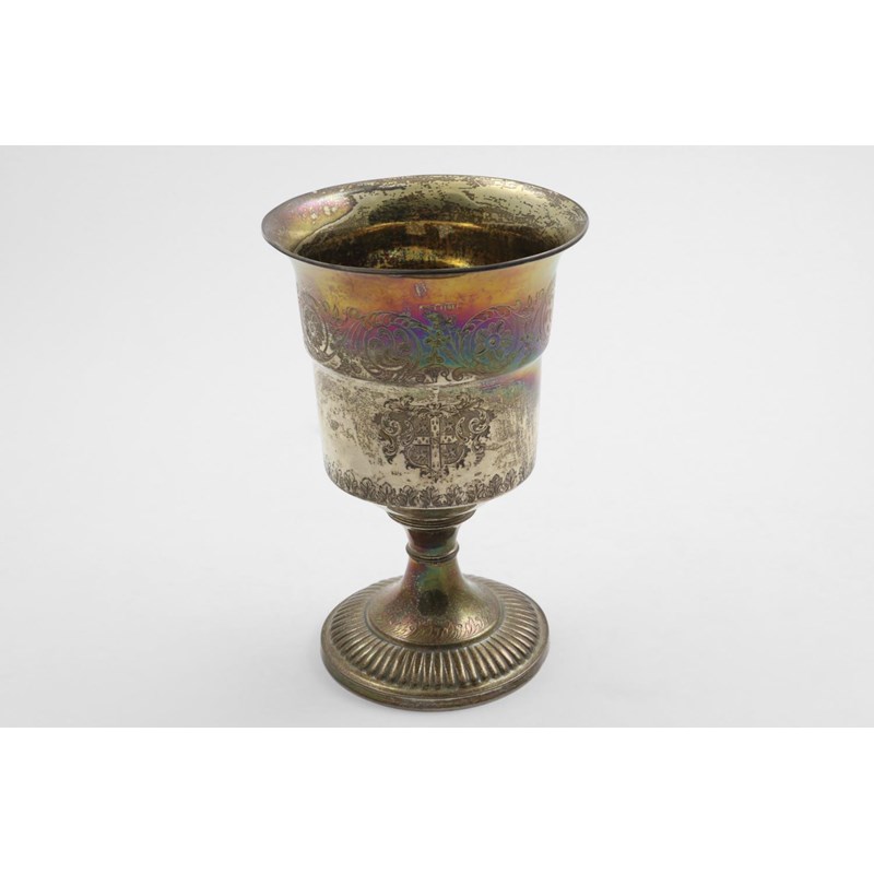 with engraved decoration, a flared bowl and a part-fluted, circular pedestal foot, engraved on one side with a coat of arms, by Rebecca Emes and Edward Barnard, London 1815; 7.5" (19 cms) high; 11.75 oz