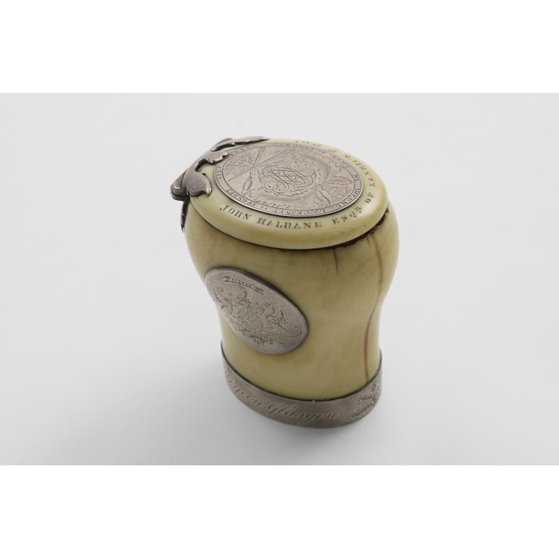 with a butterfly hinge, inscribed around the base "Charles Wilsone Surgeon Glasgow", the base engraved with the sun, moon and the motto "VICTRICI CEDAT LUX AEMULA LUCI", each side with a circular plaque; one engraved with the arms of Haldane of Gleneagles, the other unidentified, the cover plaque with engraved cypher, motto and crossed sword & sceptre, bordered by the inscription "JOHN HALDANE ESQ. OF LANRICK 6/10", unmarked; 3.2" (8 cms) high
