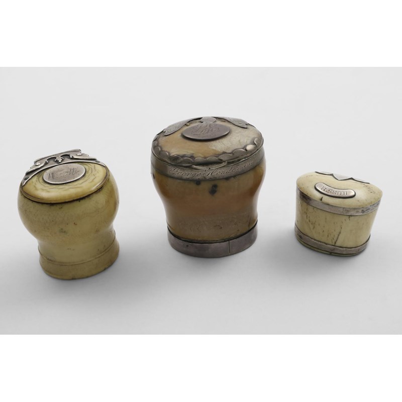 with a thistle hinge and lappet border around the cover, initialled "GTC" over "DC" and inscribed "George Henderson" on the collar, unmarked, together with a smaller early 19th century mounted bone snuff mull inscribed "R. SMITH", and another mid 18th century example, initialled "WM"; the smallest one 1.75" (4.5 cms) high (3)