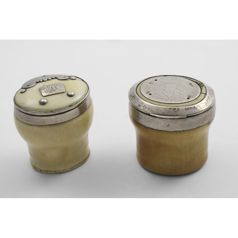 with an initialled cartouche and four studs in the cover, together with another example with a large oval cartouche, inscribed "M Nicol", initialled "ME" and also inscribed with an indistinct motto, the base incised with concentric ovals, both unmarked; the latter 2.3" (6 cms) high (2)