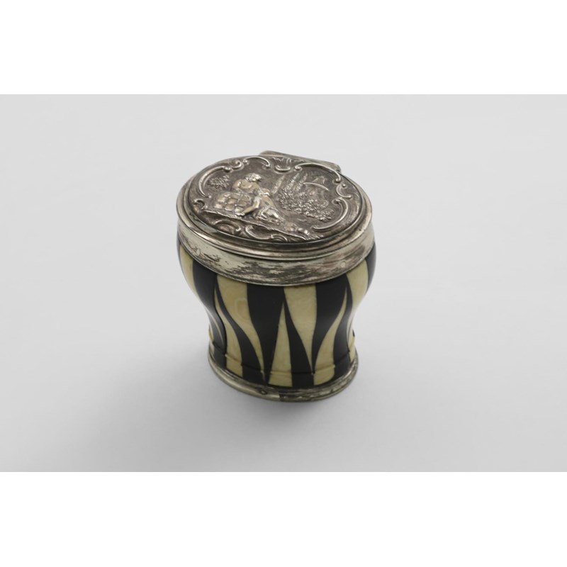 with alternating vertical, triangular staves, the cover inset with an oval repousse-work plaque, depicting a putti with a wool bale in a garden setting, unmarked, c.1765; 2.5" (6.4 cms) high