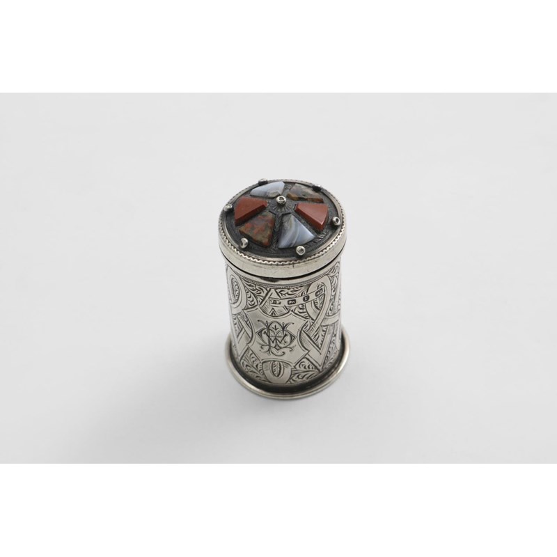 with an engraved cylindrical body, a ring-turned base (for striking) and a hinged cover set with a pattern of coloured agates and beads, monogrammed, gilt interior, by James Fenton, Birmingham 1891; (5.3cm) long; 0.95oz