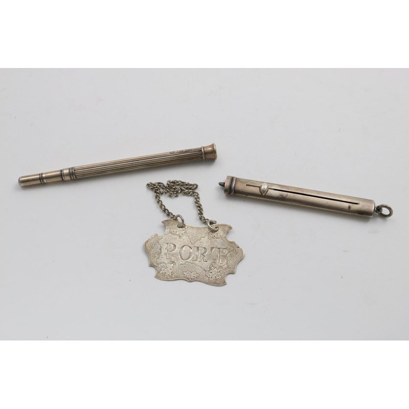 with reeded decoration and a citrine seal terminal, by Sampson Mordan, London 1847, a porte crayon by the same maker and a George II wine label "PORT", by Lewis Hamon*, London 1739-55 (no date letter); the pencil 5.5" (14 cms) long; 1.25 oz (3)