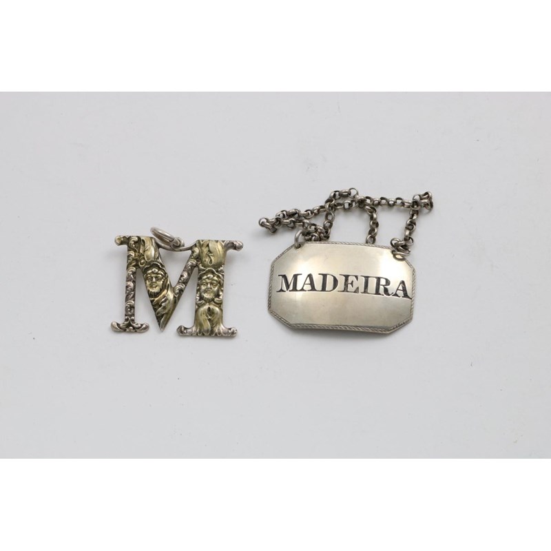 with a feather-edge, incised and filled "MADEIRA", by Lea & Co., Birmingham 1828, and a silvergilt cut-out letter "M" wine label, by Joseph Wilmore, Birmingham 1829; the latter 1" (2.5 cms) high; 0.4 oz (2)