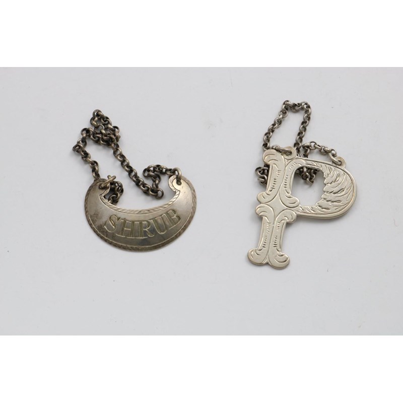 with feather-edging, incised "SHRUB", by Edward Livingstone of Dundee (EL, pot of lilies), 1790-1800, together with an engraved cut-out letter "P" wine label, maker's mark "MK" (conjoined), Edinburgh 1825-35; the latter 1.75" (4.4 cms) high; 0.55 oz (2)