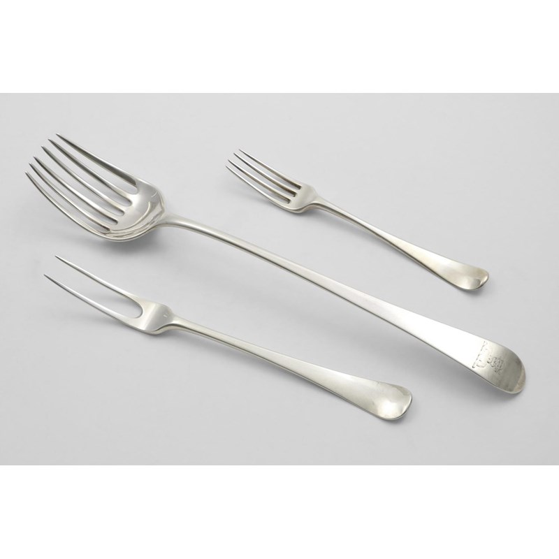 with six tines, crested, maker's mark only struck four times, c.1770, a George III Irish two-prong table fork, crested, by John Pittar, Dublin 1791 and a George III dessert fork; the serving fork 11.4" (29 cms) long; 6.4 oz (3)