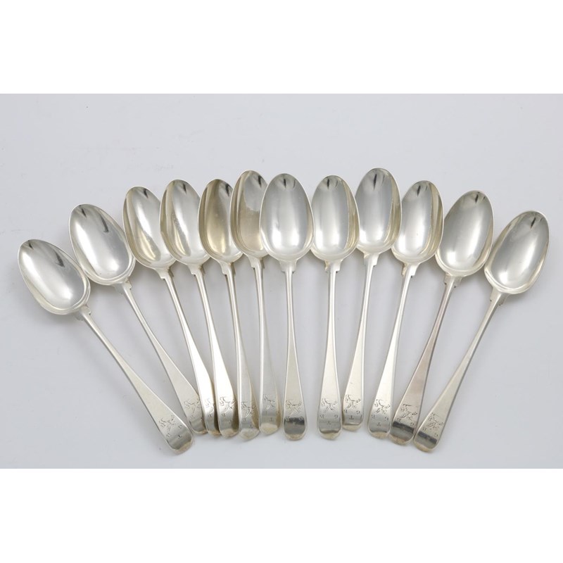 A set of twelve early 'George III dessert spoons, Old English pattern with shoulders, engraved with the initials "T" over "GE" and the crest of the Inner Temple, probably by William Tant, London 1763; 15.4 oz  (12)